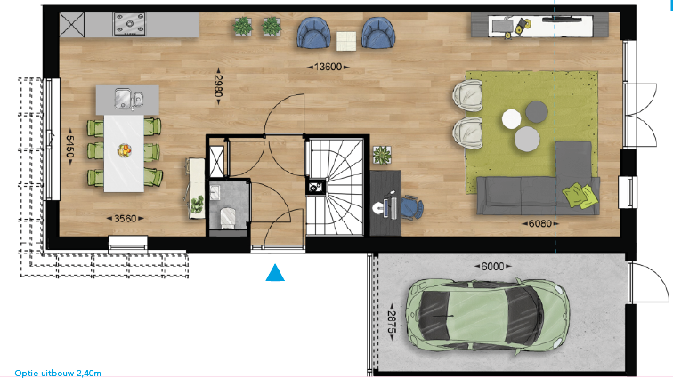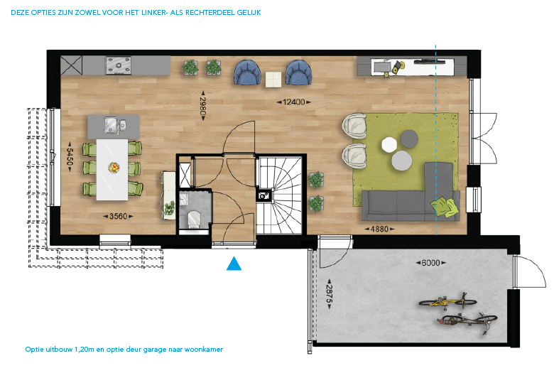 Optie uitbouw 1,20m en optie deur garage naar woonkamer