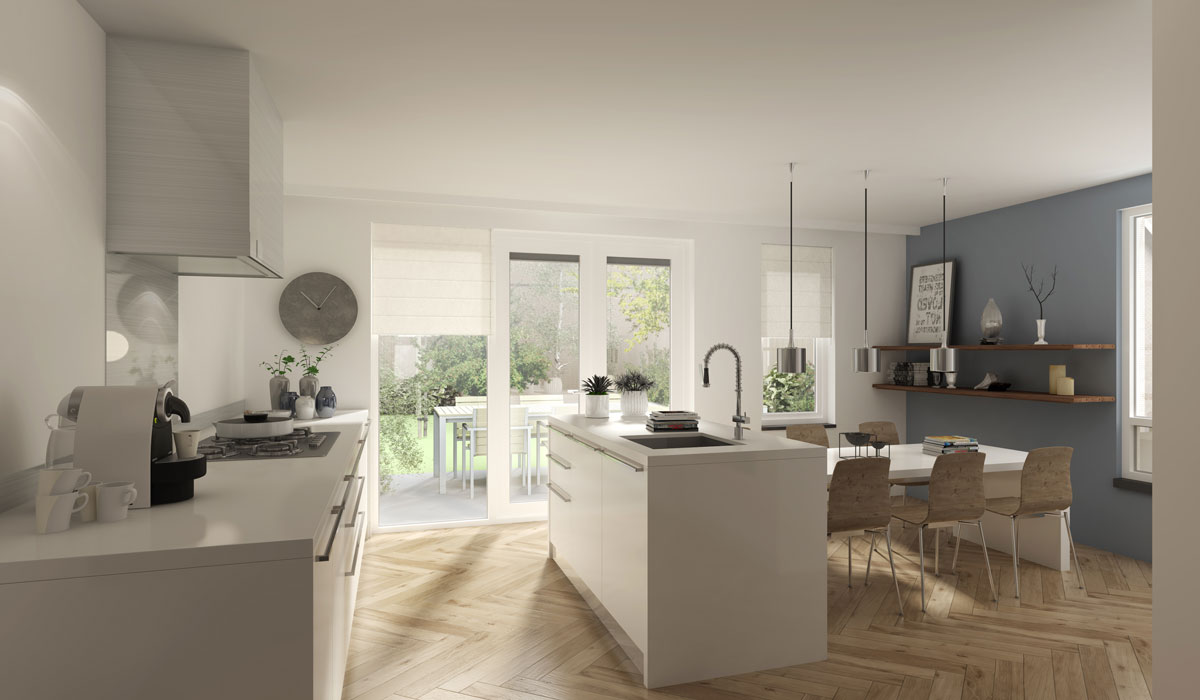 Royale twee-onder-een-kapwoning met tuin op het westen en grote bergruimte in moderne eigentijdse architectuur. De wo- ningen hebben veel uitbreidingsmogelijkheden en de indeling van de woningen is flexibel, de keuken kan zowel aan de voor- als achterzijde van de woning.
