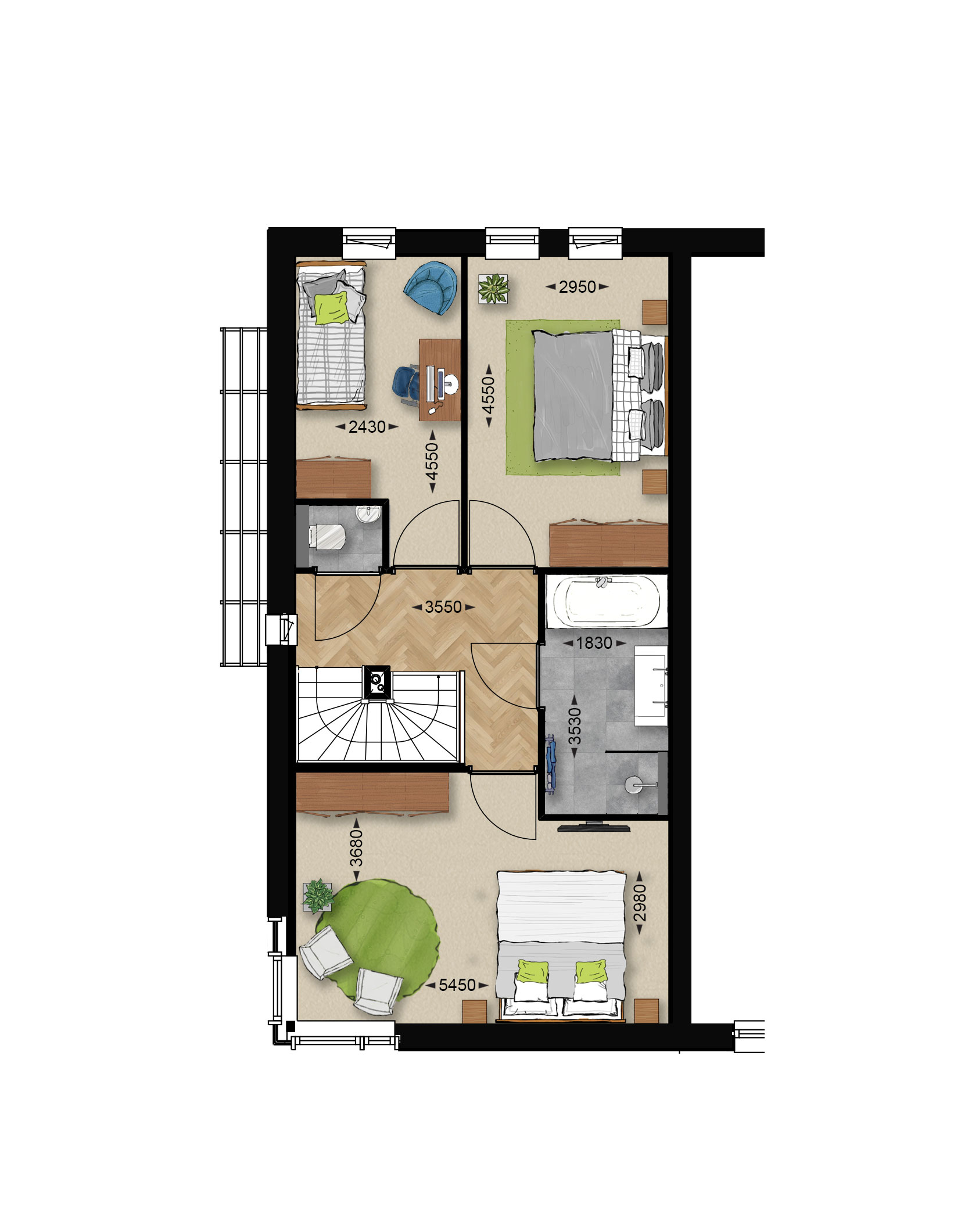 - 3 slaapkamers (9,5, 13 en 18,5m2) en de mogelijkheid een extra slaapkamer op de zolder te maken
