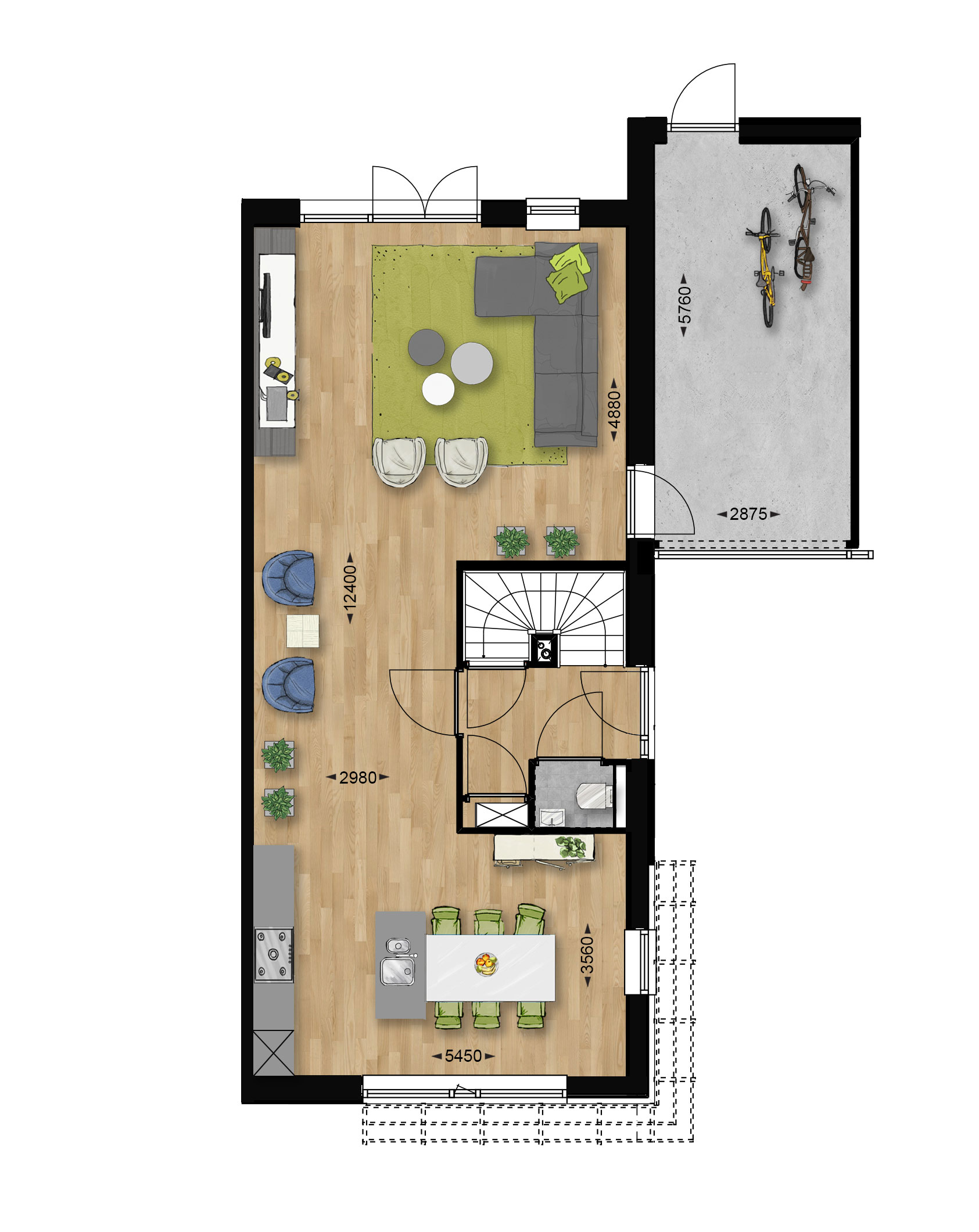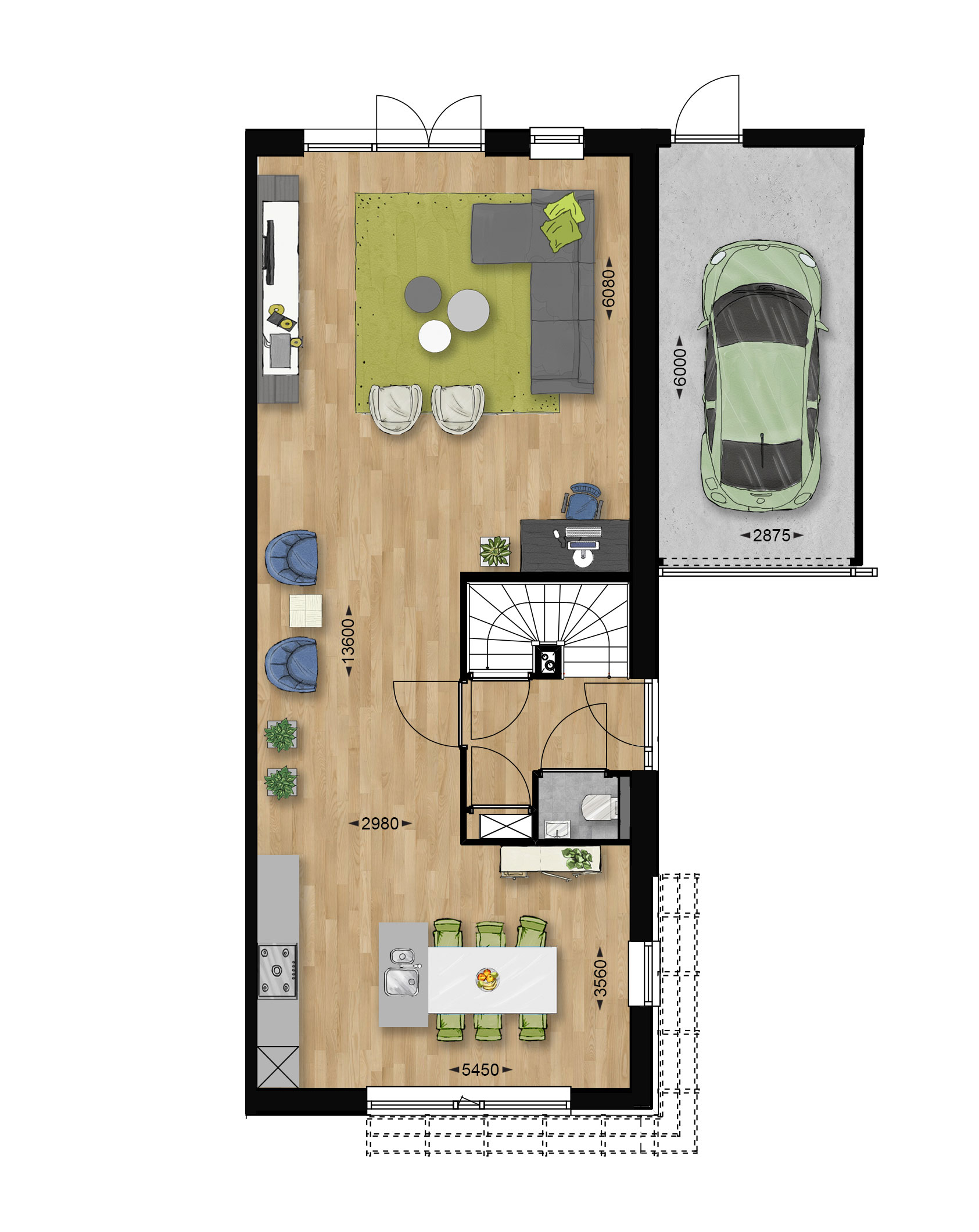 Optie uitbouw 1,20m, optie om van garage geïsoleerde berging te maken met deur naar de woonkamer