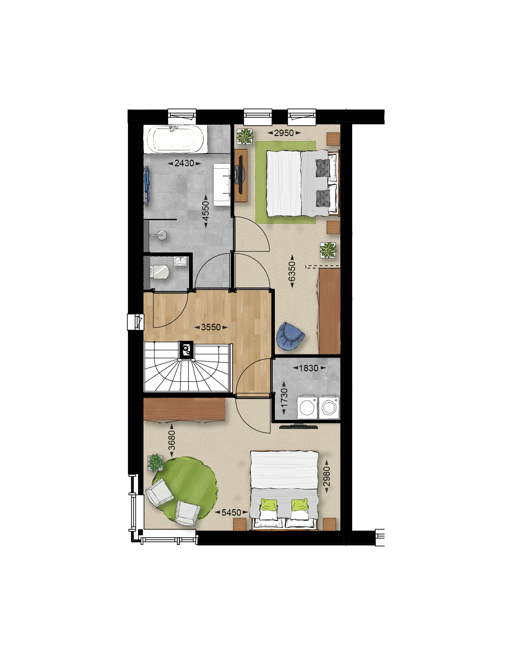 Optie badkamer aan gevel, wasruimte, 2 slaapkamers